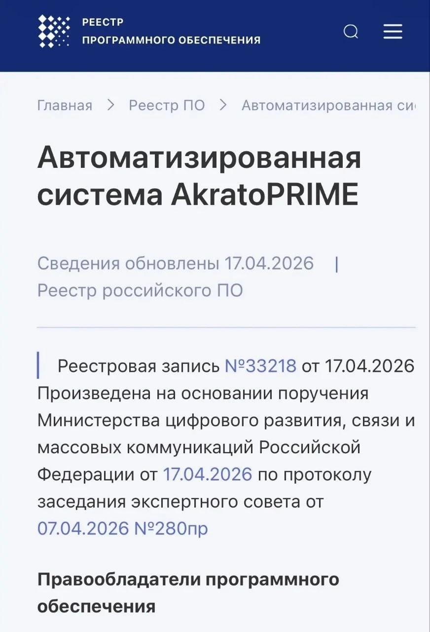 17 апреля мы получили уведомление, что Автоматизированная система АкратоПРАЙМ на основании поручения Министерства цифрового развития, связи и массовых коммуникаций Российской Федерации была включена в реестр Отечественного ПО